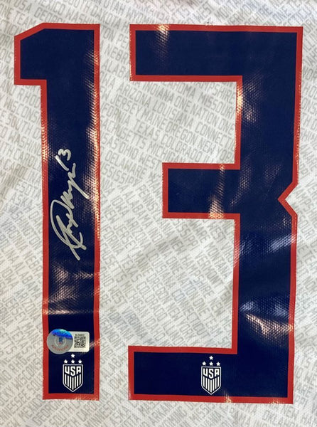 Featured is an Alex Morgan signed Nike USA women's soccer jersey. This jersey has been hand signed by Morgan and comes with the Beckett hologram and certificate of authenticity. This jersey is size XL. This jersey would make a great addition to any sports memorabilia collection! SPECIFICATIONS Autographed By: Alex Morgan Team: USA Sport: Soccer Authentication: Beckett Grading Services