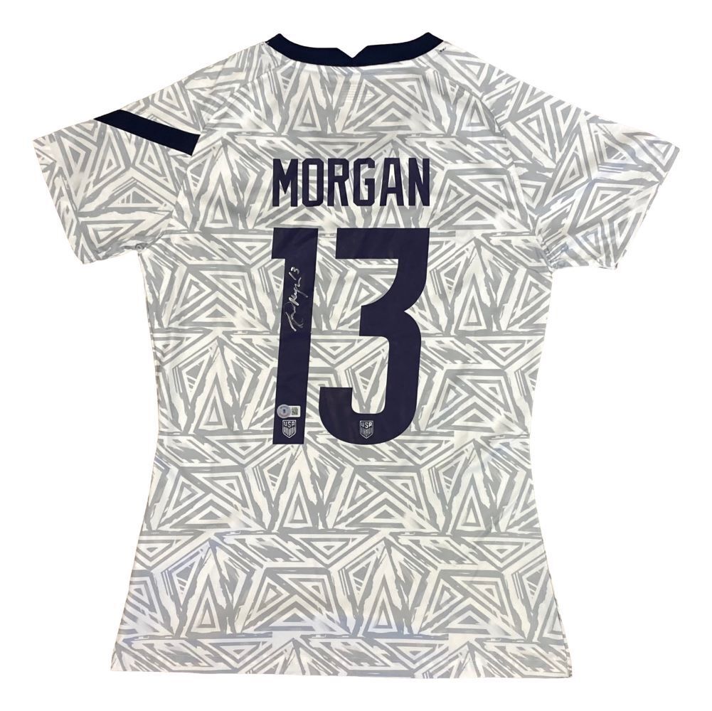 Featured is an Alex Morgan signed Nike USA women's soccer jersey. This jersey has been hand signed by Morgan and comes with the Beckett hologram and certificate of authenticity. This jersey is size Large. This jersey would make a great addition to any sports memorabilia collection! SPECIFICATIONS Autographed By: Alex Morgan Team: USA Sport: Soccer Authentication: Beckett Grading Services
