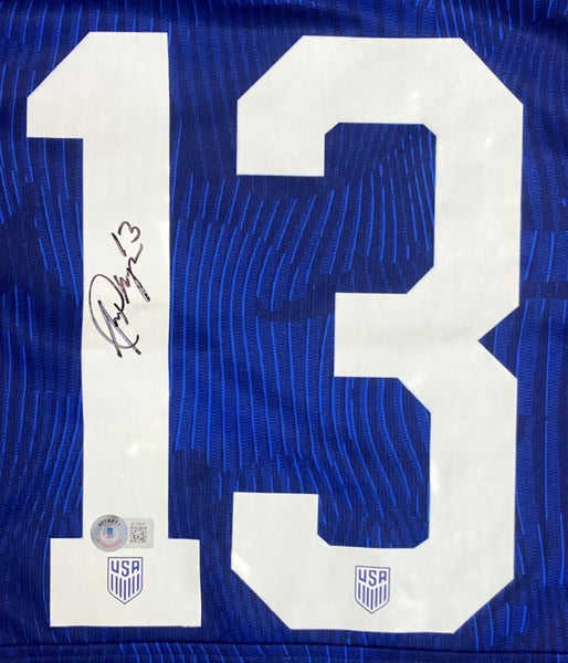 Featured is an Alex Morgan signed Nike USA women's soccer jersey. This jersey has been hand signed by Morgan and comes with the Beckett hologram and certificate of authenticity. This jersey is size Large. This jersey would make a great addition to any sports memorabilia collection!. SPECIFICATIONS Autographed By: Alex Morgan Team: USA Sport: Soccer Authentication: Beckett Grading Services