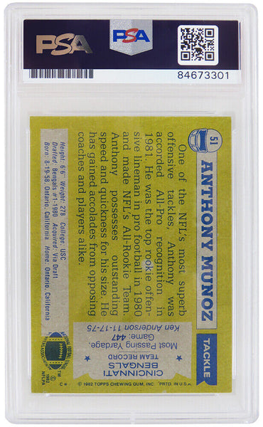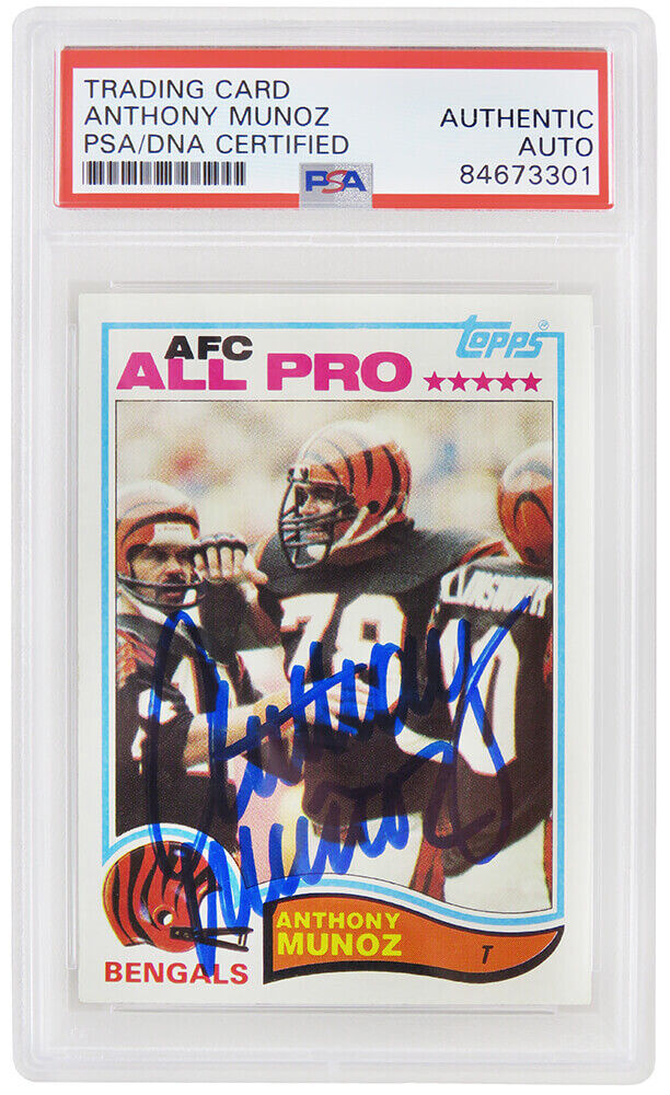 Anthony Munoz signed Cincinnati Bengals 1982 rookie football trading card #51. The card has been authenticated and encapsulated by PSA/DNA and the number can be verified online. The image of the item is a stock photo, as we may have multiples of the item in stock. The Slabbed Card you will receive will be of the card described. (Same grade, Same authentication) You may or may not receive the exact PSA serial number on the slab label shown in image.