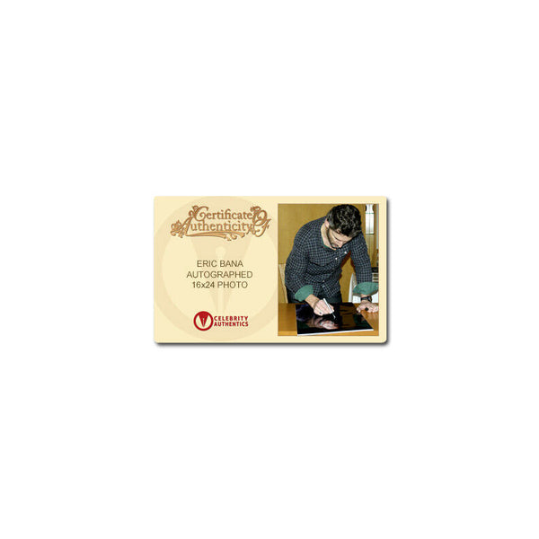 This 16x24 studio photo of Eric Bana has been personally hand-signed by Eric during his signing with Celebrity Authentics. Ships affixed with Celebrity Authentics serial-numbered and tamper evident Authentication Hologram and includes Celebrity Authentics Certificate of Authenticity featuring picture of Eric signing photo. Please note: with multiples signed by the actor, a sample photo is used from stock to represent what you will receive. Exact autograph size and placement may vary.