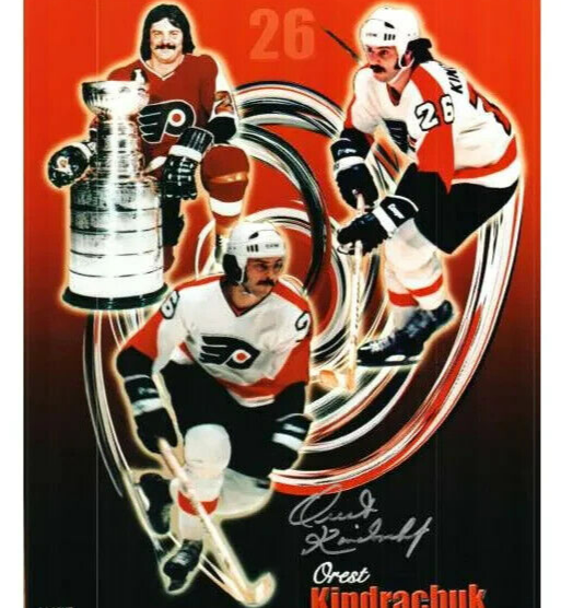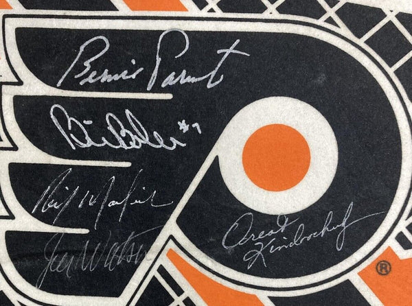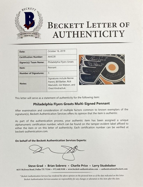 Philadelphia Flyers pennant has been hand-signed by (5) Flyers legends. Signers include Bernie Parent (HOF), Bill Barber (HOF), Rick Macleish (D. 2016), Joe Watson, and Orest Kindrachuk.The autograph includes an official Beckett Authentication Services hologram and matching Full Letter of Authenticity.Authentication: Beckett LOA