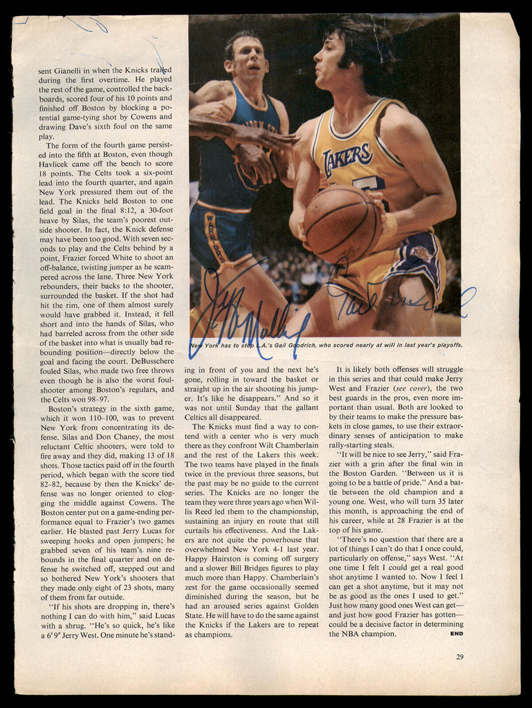 This is a 8x11 Magazine Page Photo that has been hand signed by Gail Goodrich & Jeff Mullins. There is a tear near the top of the item as shown. This item is guaranteed to pass any third party authentication company including Beckett, PSA/DNA & JSA authentication.