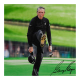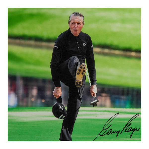 It's difficult to contain the contributions Gary Player made the sport of golf and the human race really in a few sentences. He was a championship golfer who traveled the planet promoting the great game. At the same time, he was a champion for human rights and animal rights causes all over the world. He received the Bob Jones Award by the USGA in 1966 and eight years later was inducted into the World Golf Hall of Fame. On the course, he captured 24 wins on the PGA Tour, including nine major championships. One of his signature moves was kicking his leg high in the air after a made putt. Showing his flexibility as he enters his 80s, Player is seen here celebrating another made putt. Player has signed this limited edition (25) The Kick 16" x 20" image in black paint pen. His signature is deemed authentic by virtue of Upper Deck Authenticated's Five Step Process.