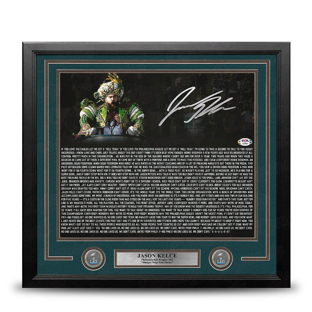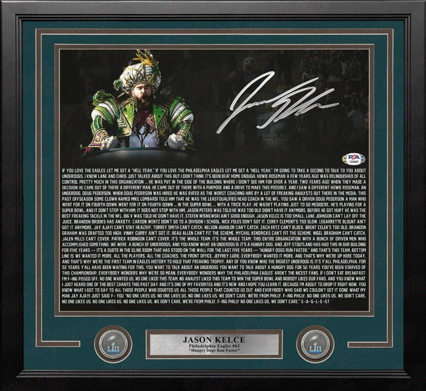 Signed picture of Eagles star Jason Kelce with the full text of his Super Bowl LII championship speech; authenticated by PSAThis limited edition photo has been hand-signed by Philadelphia Eagles star Jason Kelce. Kelce made an incredible victory speech during the Eagles Super Bowl LII championship Parade while dressed in classic a Mummers outfit. This photo includes the text from the classic speech in its entirety! It has been authenticated by PSA.Hand-Signed by Philadelphia Eagles star Jason KelceSignature is bold and clear on the photoAuthenticated with PSA serially numbered hologramFramed and matted photos are professional qualityIncludes Super Bowl LII championship medallions!Framed 11" x 14" photo measures 18" x 22"