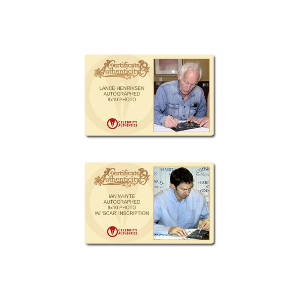 This 8x10 photo of Scar and Weyland battling from AVP: Alien vs Predator has been personally hand-signed by Lance Henriksen and Ian Whyte during their signings with Celebrity Authentics. Photo ships affixed with Celebrity Authentics serial-numbered and tamper evident Authentication Hologram and includes Celebrity Authentics Certificates of Authenticity featuring picture of Lance and Ian signing photo. Please note: with multiples signed by the actor, a sample photo is used from stock to represent what you will receive. Exact autograph size and placement may vary.