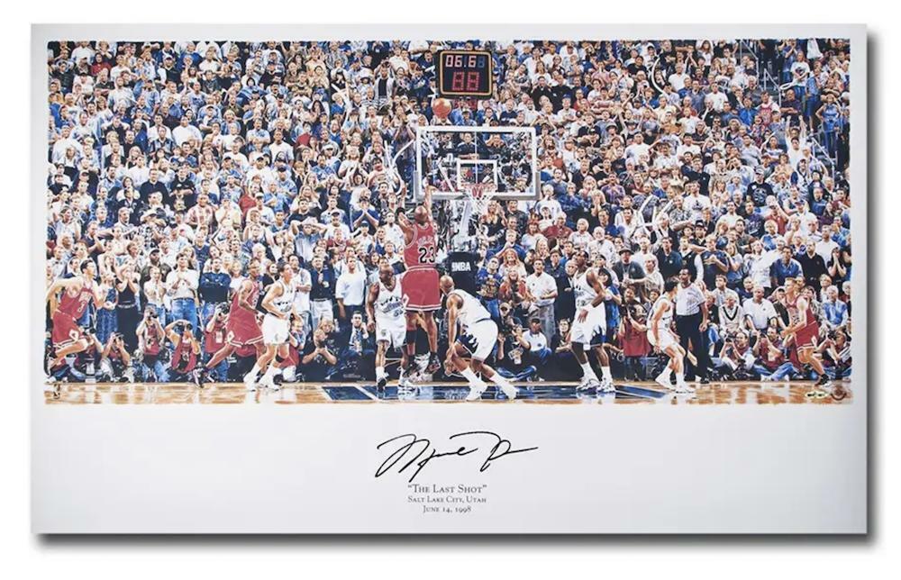 Game 6 of the 1998 NBA Finals was played on June 14th, at the Delta Center between the Chicago Bulls and the Utah Jazz. With the game on the line, both teams knew the ball would end up in Michael Jordan's hands.The Jazz's best perimeter defender, Byron Russell had the daunting task of trying to stop the league's greatest player. With the clock dwindling down, Jordan crossed over Russell and hit a 20-foot jump shot to give the Bulls an 87-86 lead with 5.2 seconds left. The clutch shot gave the Bulls an 87-86 victory and their 6th championship in 8 years.Jordan finished the game with 45 points on his way to earning his 6th Finals Most Valuable Player award. It would be Michael Jordan's final shot in a Bulls uniform. This 36"x22" Michael Jordan autographed picture captures number 23's last shot as a Chicago Bull.Jordan's autograph has been authenticated by virtue of UDA's Five-Step Authentication Process. This piece is a replica art print of world renowned memorabilia artist Chuck Gillies original commissioned painting of Michael Jordan's last shot vs the Utah jazz in the 1998 NBA finals. MONEY BACK GUARANTEE! If for any reason you are not completely satisfied with the quality or authenticity of your purchase, we will gladly give you a full refund or exchange, whichever you prefer up to 30 days after purchase. Please feel free to e-mail us with any questions. Thank you. Authenticator Pre-Certified Authenticator: Upper Deck Authenticated History of item: Michael Jordan signed this item in the presence of a representative from Upper Deck Authenticated. Describe how you came to possess this item: Super Sports Center is a fully authorized dealer for Upper Deck Authenticated as well as Mounted Memories and Steiner Sports. Other information about you and / or the item: Super Sports Center strives to deliver the most authentic in sports memorabilia from trusted companies like Mounted Memories, Steiner Sports and Upper Deck Authenticated. If it exists, we can find it for you!