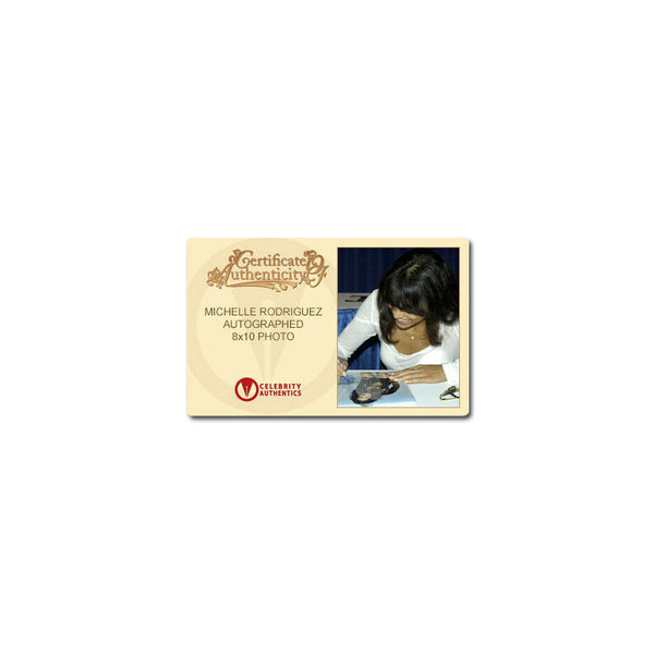 This 8x10 photo has been personally hand-signed by the beautiful Michelle Rodriguez during her signing with Celebrity Authentics. Item ships affixed with Celebrity Authentics serial-numbered and tamper evident Authentication Hologram and includes Celebrity Authentics Certificate of Authenticity featuring picture of Michelle signing photo. Please note: with multiples signed by the actor, a sample photo is used from stock to represent what you will receive. Exact autograph size and placement may vary.