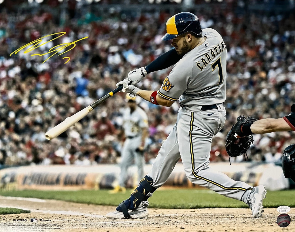 An 16x20 hand signed photo of MILWAUKEE BREWERS Catcher VICTOR CARATINI. The signature is in Yellow paint pen. This item was signed at a private signing in our store. This would make a great addition to any BREWERS collection! This item is guaranteed to be 100% authentic and will include a COA from JSA authentication.