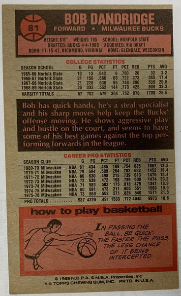 Milw Bucks NBA Champ BOB DANDRIDGE Signed 1976-77 Topps Card #81 AUTO - HOF
