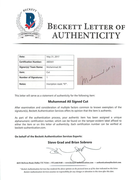 This is a 8.75x11.75 Book Page Inscribed "97" that has been Personally Signed & Autographed by Muhammad Ali. This item is 100% Authentic to include a Certificate of Authenticity (COA) / hologram by Beckett Authentication Services #A80441. We no longer have the book this page was cut from. We offers a 100% Lifetime Guarantee on all Autographed & Signed Muhammad Ali memorabilia.