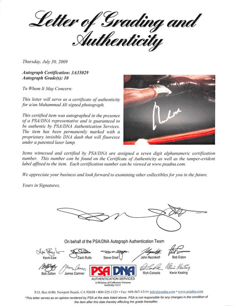 This Autographed Auto Grade Gem Mint 10! 20x24 Photo has been Personally Signed by Muhammad Ali. This item is 100% Authentic and comes with a PSA/DNA Certification Card and a matching numbered Hologram. This is a PSA in the Presence Authenticated item which means a PSA representative was present when this item was being signed. The authenticity can be verified on Professional Sports Authenticator website.