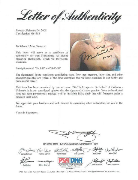 This MUHAMMAD ALI BOXING AUTHENTIC SIGNED 8X11 MAGAZINE PAGE PHOTO PSA/DNA #G61386 has been certified authentic. It will include the PSA/DNA numbered hologram and matching Certificate of Authenticity.
