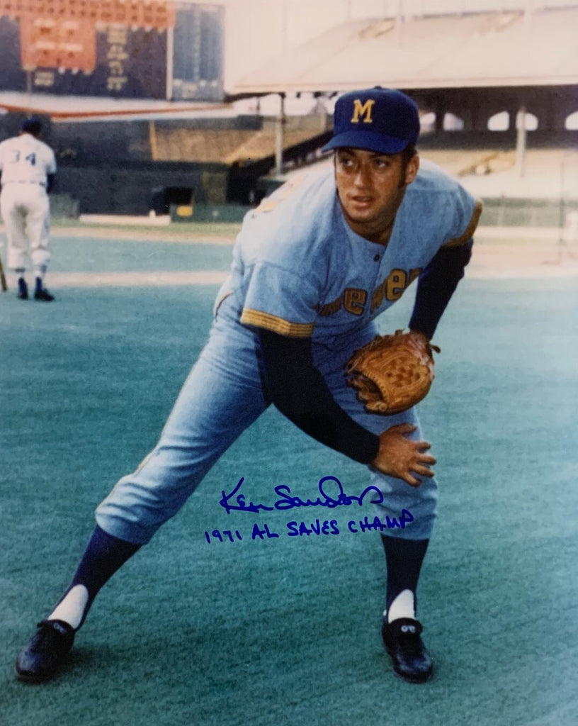 An 8x10 hand signed photo of former Milwaukee Brewers Pitchert KEN SANDERS. The signature is in blue sharpie and includes the inscription "1971 AL Saves Champ". SANDERS was a member of the original 1970 Brewers Team!. This item was signed at a public signing in our store in 2010. This would make a great addition to any BREWERS collection! This item is guaranteed to be 100% authentic and will include a store COA with matching serial numbered holograms.