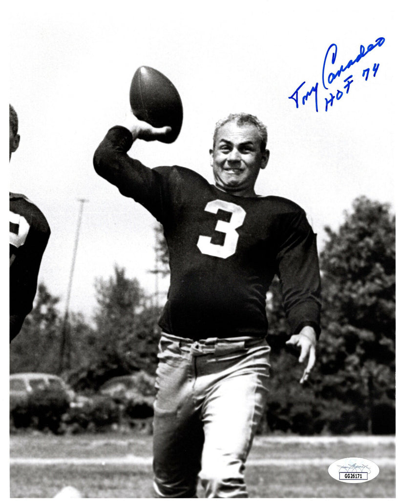 An 8x10 hand signed color photo of Green Bay Packers Hall of Famer TONY CANADEO (deceased). The signature is in Blue Sharpie with the inscription "HOF '74". This would make a great addition to any Packers collection as he is a very hard autograph to obtain. This photo was signed at a private signing. This item is guaranteed to be 100% authentic and will include a COA from JSA Authentication.