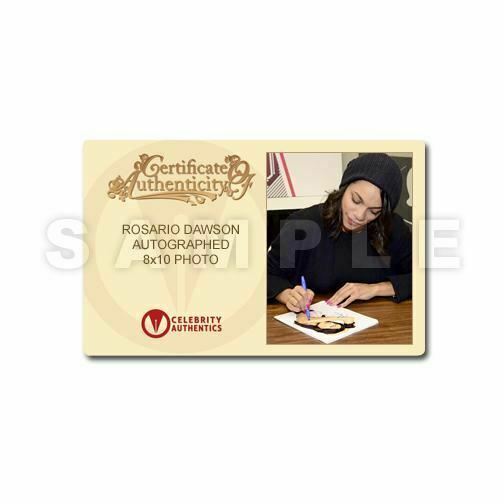 This 8x10 portrait photo has been personally hand-signed Rosario Dawson during her signing with Celebrity Authentics. Best known for her roles in Kids, Men in Black II, Clerks II, Sin City and many more. Ships affixed with Celebrity Authentics serial-numbered and tamper evident Authentication Hologram and includes Celebrity Authentics Certificate of Authenticity featuring picture of Rosario signing photo. Please note: with multiples signed by the actor, a sample photo is used from stock to represent what you will receive. Exact autograph size and placement may vary.