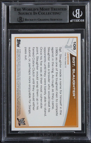 This Autographed 2013 Topps WWE #105 Card has been Personally Signed by Sgt. Slaughter. This item is 100% Authentic, it comes slabbed and authenticated by Beckett Authentication Services. The authenticity can be verified on Beckett Authentication Services website.