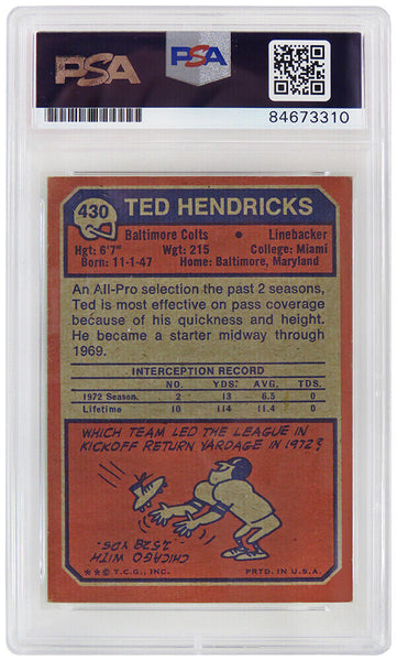 Ted Hendricks signed Colts 1973 Topps football card #430 with 'HOF 90' inscription. The card has been authenticated and encapsulated by PSA/DNA and the number can be verified online. The image of the item is a stock photo, as we may have multiples of the item in stock. The Slabbed Card you will receive will be of the card described. (Same grade, Same authentication) You may or may not receive the exact PSA serial number on the slab label shown in image.