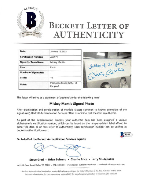 This Autographed Auto Graded Gem Mint 10! 11x14 Photo with the inscription of "Father of the Year?" has been Personally Signed by Mickey Mantle of the New York Yankees. This item is 100% Authentic to include a Certificate of Authenticity (COA) / hologram by Beckett Authentication Services. The authenticity can be verified on Beckett Authentication Services website.