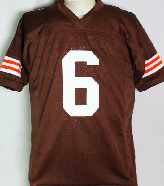 Baker Mayfield Autographed Brown Pro Style Jersey- Beckett W *Black *M6 THIS IS NOT AN NFL JERSEY. THIS HAS NO TAGS, NO LOGOS, NO EMBLEMS. This is a Baker Mayfield of the Cleveland Browns hand autographed custom made (non name brand) authentic style (stitched letters and numbers) jersey. This item has a Beckett Witnessed Authentication, which comes with a numbered sticker and a matching Beckett Certificate of Authenticity. You can view this item on the Beckett Authentication website. It was signed either at a public autograph appearance or a private signing. This is a stock photo of the item. Although you may not receive this exact item, the item you receive is virtually identical, brand new, and in great shape. Jersey size is XL.