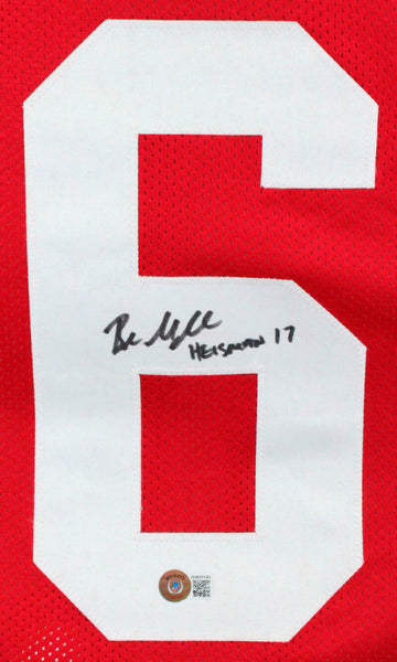 Baker Mayfield Autographed Red College Style Jersey W/Heisman 17- Beckett W *Black THIS IS NOT AN NCAA JERSEY. THIS HAS NO TAGS, NO LOGOS, NO EMBLEMS. This is a Hand Autographed Jersey of Baker Mayfield inscribed with Heisman 17. This is Custom Made (Non Name Brand) Authentic Style (Stitched Letters and Numbers) Jersey. This item has a Beckett Authentication, which comes with a #'ed Sticker and a Matching COA. You can view this item on the Beckett website, it shows when and where the item was signed. It was signed either at a public autograph appearance or a Private Signing. This is a stock photo of the item. Although you may not receive this exact item, the item you receive is virtually identical and brand new in great shape. Jersey size is XL.