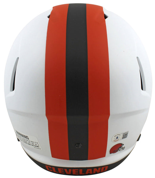 This Autographed Alternate Lunar Riddell Full Size Speed Rep Helmet has been Personally Signed by Baker Mayfield of the Cleveland Browns. This item is 100% Authentic to include a hologram by Beckett Authentication Services. This item will come with the new Beckett Authentication hologram that has a scannable QR code rather than the traditional COA. If you would like to have a COA, you are welcome to reach out to Beckett for a printed certification once you receive your item. This is a BAS Witnessed Protection Program item which means a Beckett Authentication Service representative was present when this item was being signed. This is a stock item. We conducted an autograph signing with Baker Mayfield and we have several of these available. The one you will receive will be of equal quality to the one pictured. This item can be verified through BAS Witnessed.