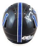 This Autographed Alternate On-Field 2023 Speed Mini Helmet with the inscription of "HOF 75" has been Personally Signed by Lenny Moore of the Baltimore Colts. This item is 100% Authentic to include a hologram by Beckett Authentication Services. This item will come with an affixed Beckett Authentication Services (BAS) authentication sticker, which includes a scannable QR code to verify authenticity. Please note that Beckett no longer provides serial-numbered COA cards, and the attached BAS sticker will serve as the complete authentication for this item. This is a BAS Witnessed Protection Program item which means a Beckett Authentication Service representative was present when this item was being signed. We conducted an autograph signing with Lenny Moore where multiples of the same item were signed. While the photographs are representative of this item, the size, placement and strength of the signature may vary. Each item is hand signed, therefore, each autograph is unique. This item can be verified through BAS Witnessed.
