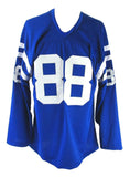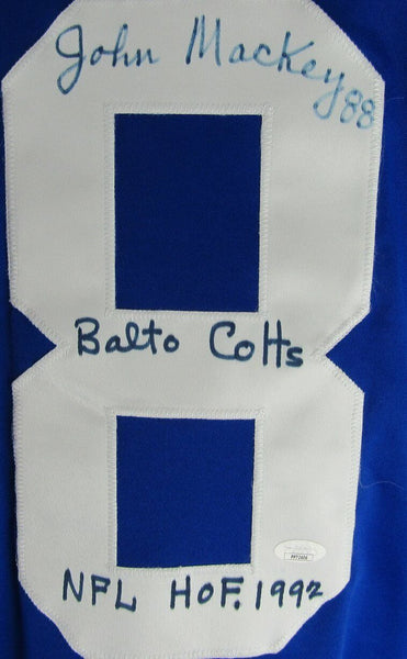 John Mackey HOF Signed/Inscribed "Balto Colts NFL HOF. 1992" Baltimore Colts Blue Custom Football Jersey Size XL. This jersey is authenticated by JSA and includes their Tamper-proof Sticker and Certificate of Authenticity.