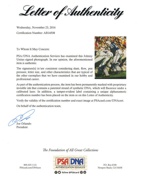 The number in the listing title is just an inventory sku for our records and is not the authentication number. This is the exact item that you will receive so please see pictures for condition. This is an 8x10 photo that was personally autographed by Johnny Unitas. Includes a certificate of authenticity from Professional Sports Authentication (PSA) and Denver Autographs.