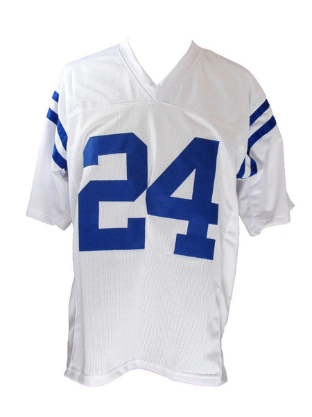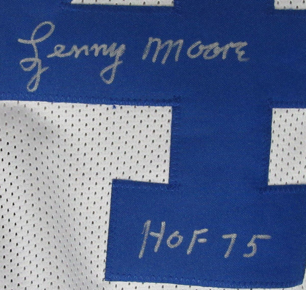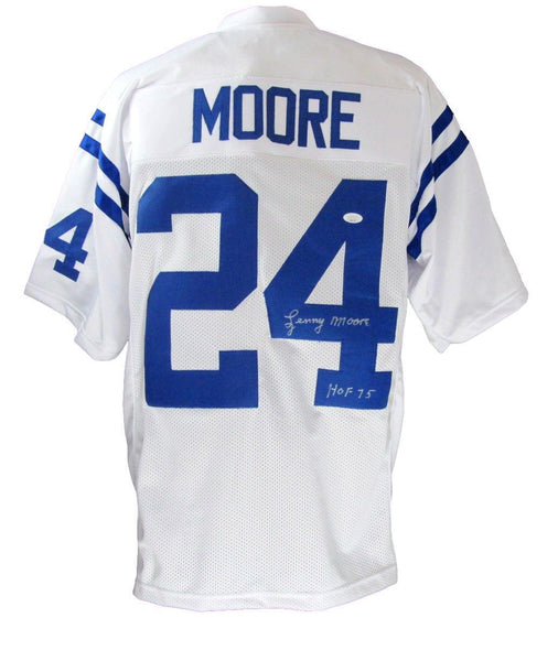Lenny Moore HOF Autographed/Inscribed "HOF 75" Baltimore Colts White Custom Football Jersey Size XL. This jersey is authenticated by JSA and includes their Tamper-proof Sticker and Certificate of Authenticity.