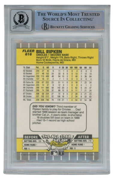 The number in the listing title is just an inventory sku for our records and is not the authentication number. The item pictured is the exact image you will receive, please see photos for condition. This is a Baltimore Orioles 1989 Fleer #616 Error FF Variation Grade 10 Slabbed Trading Card that was personally autographed by Billy Ripken. Includes a certificate of authenticity from Beckett Authentication Services (BAS) and Denver Autographs. FREE SHIPPING within the USA on orders over $10!