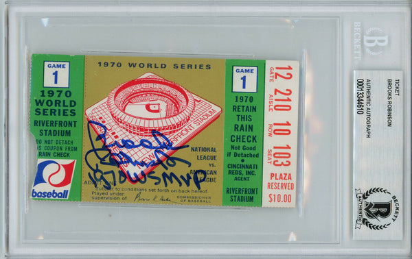 Brooks Robinson Autographed 1970 World Series Ticket Game 1 MVP BAS Slab 31608 The number in the listing title is just an inventory sku for our records and is not the authentication number. This is a 1970 World Series ticket from Game 1 that was personally autographed by Brooks Robinson. This has been professionally slabbed by Beckett Authentication Services (BAS) and includes a certificate of authenticity from Denver Autographs.