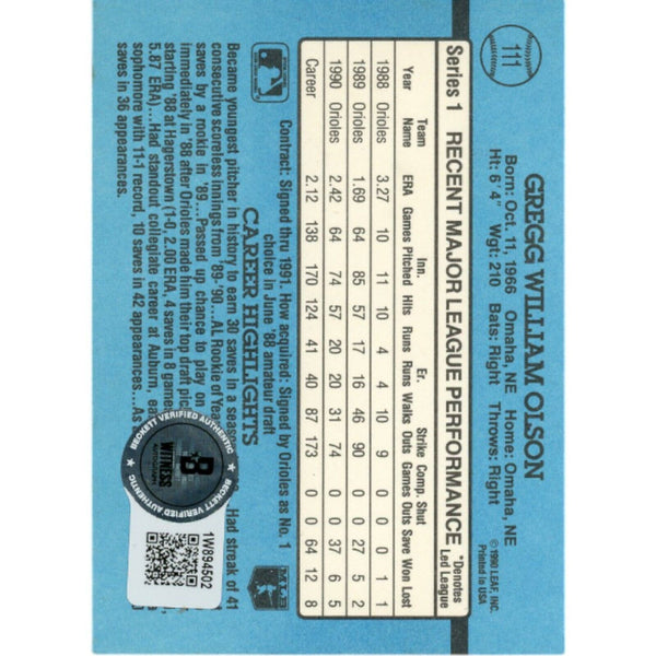 The number in the listing title is just an inventory sku for our records and is not the authentication number. The item pictured is the exact item you will receive, please see photos for condition. This is a Baltimore Orioles 1990 Donruss #111 Slabbed Trading Card that was personally autographed by Gregg Olson. Includes a certificate of authenticity from Beckett Authentication Services (BAS) and Denver Autographs.FREE SHIPPING within the USA on orders over $10!