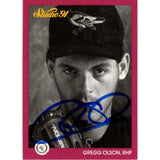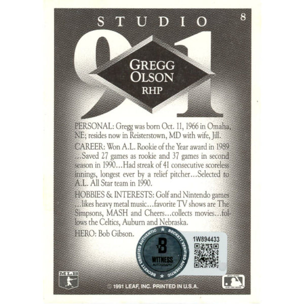 The number in the listing title is just an inventory sku for our records and is not the authentication number. The item pictured is a stock photo unless otherwise noted. This is a Baltimore Orioles 1991 Studio 91 #8 Slabbed Trading Card that was personally autographed by Gregg Olson. Includes a certificate of authenticity from Beckett Authentication Services (BAS) and Denver Autographs.FREE SHIPPING within the USA on orders over $10!
