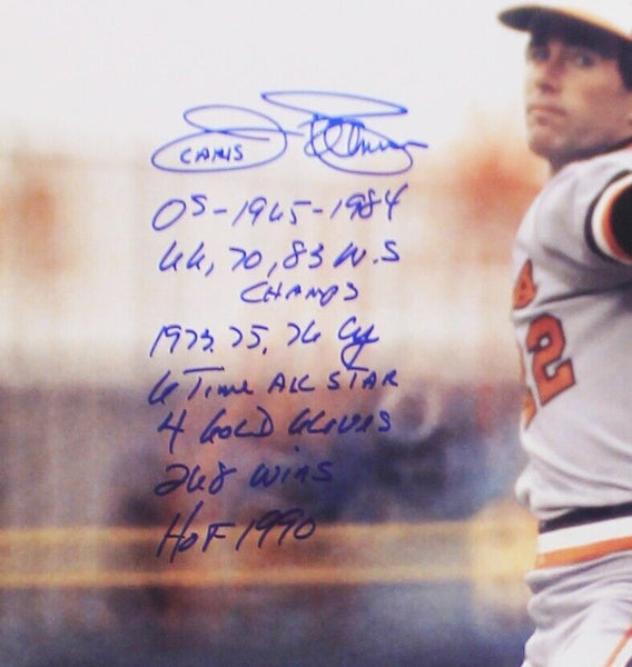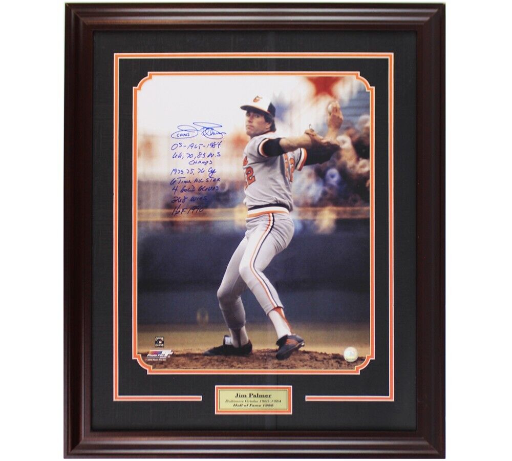 A Baltimore Orioles Framed 16x20 MLB Photo hand signed by Jim Palmer. The signaturs is in excellent condition. In addition to signing his name, Jim also inscribed "Cakes, 6O's 1965-1984, 66, 70, 83 WS Champs, 1973,75,76 CY, 6 times All Star, 4 Gold Gloves, 268 Wins, HOF 1990" on the item. The frame measures approximately 26"x31" and has some minor damage. Jim is a former professional baseball player and pitcher. He achieved many awards and accolades in his career, including 3 CY awards and 4 Gold Glove awards. AUTHENTICATION: The item is tagged with a MAB Celebrity Services Hologram