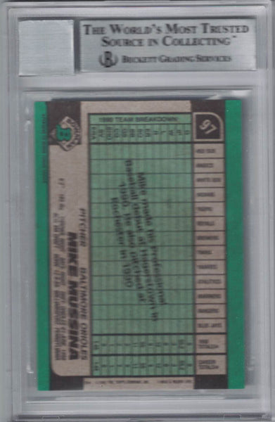 Mike Mussina Signed Baltimore Orioles 1991 Bowman Trading Card BAS 10 29576 The number in the listing title is just an inventory sku for our records and is not the authentication number. This is a 1991 Bowman #97 trading card that was personally autographed by Mike Mussina with a 10 grade autograph. This was slabbed by Beckett Authentication Services (BAS) includes a certificate of authenticity from Denver Autographs.