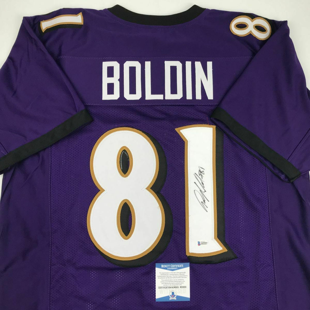 Autographed/Signed ANQUAN BOLDIN Baltimore Purple Football Jersey Beckett COA This is a custom jersey and was not manufactured by or in any manner associated with any professional sports league or manufacturer. This custom jersey carries no professional sports league designation. The item is intended to be an autographed collectible. Reference of team in the title is to allow the purchaser a point of association. The custom jersey displays the name and number of the player. This item in no way is affiliated with or connected to any professional sports organization. Size is XL unless otherwise noted.