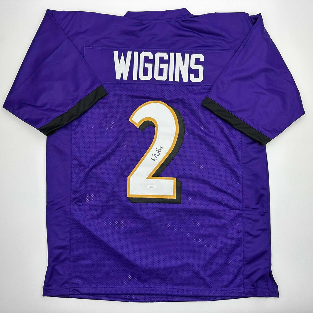 Autographed/Signed Nate Wiggins Baltimore Purple Football Jersey JSA COA Jersey has no brand names or logos. This is a custom jersey and was not manufactured by or in any manner associated with any professional sports league or manufacturer. This custom jersey carries no professional sports league designation. The item is intended to be an autographed collectible. The custom jersey displays the name and number of the player. This item in no way is affiliated with or connected to any professional sports organization. Size is XL.