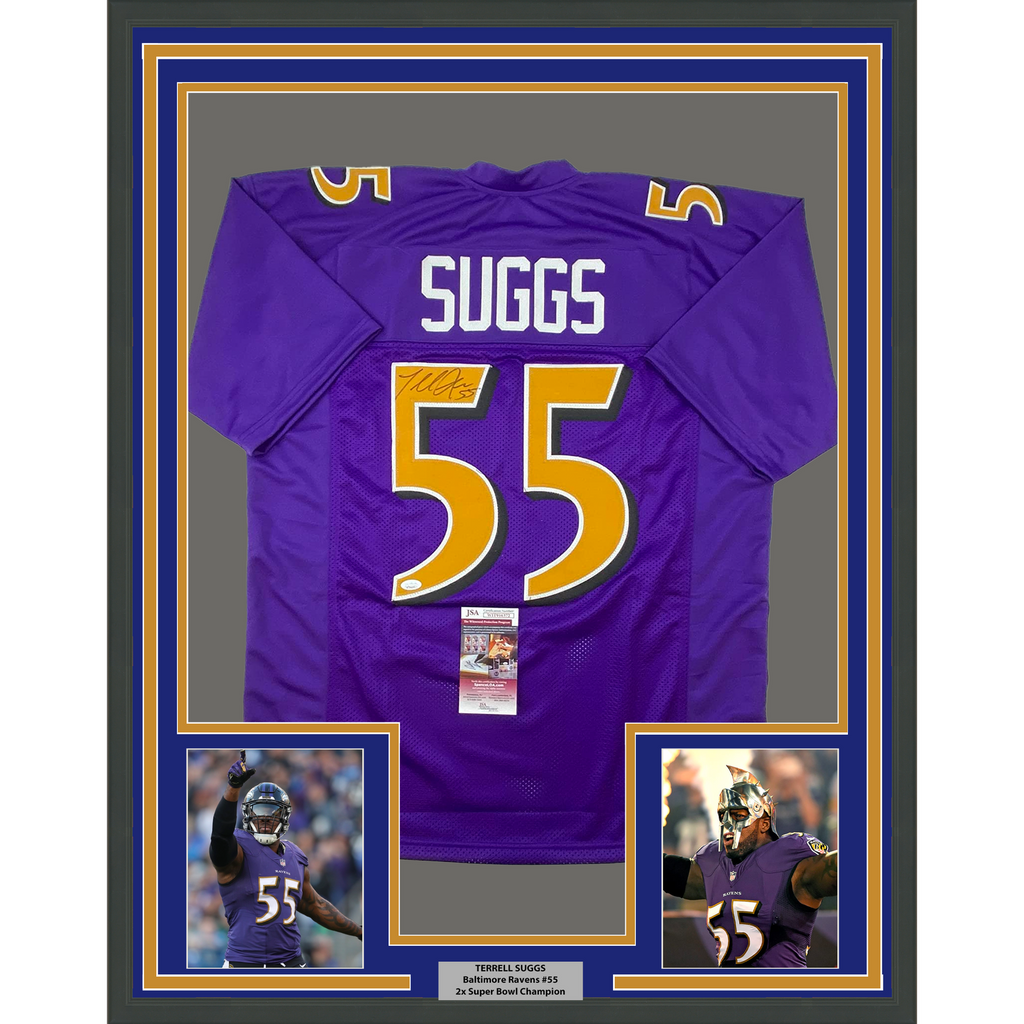 Framed Autographed/Signed Terrell Suggs 33x42 Baltimore Football Jersey JSA COA