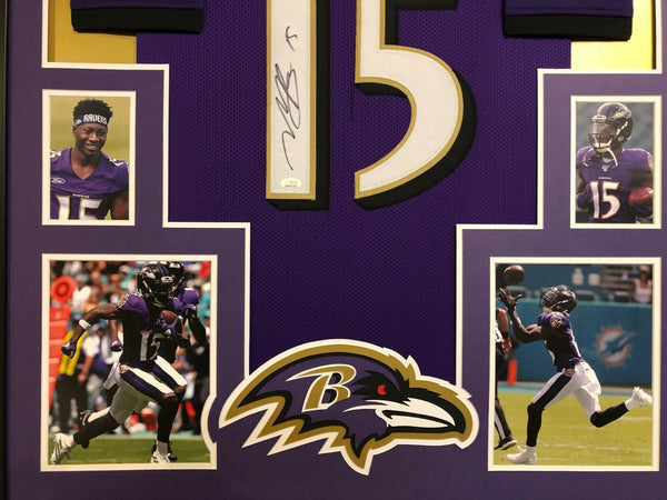 Custom Framed Marquise Brown hand signed Baltimore Ravens custom jersey. JSA Hologram and COA(#WPP657204) The authentication is from JSA. This signature is authenticated a representative of JSA! 100% AUTHENTIC!!! The jersey has fully stitched numbers on the front and back. It is a great item and a must for all great sports fans! This item is professionally framed, it measures 32"x40" inside , 42"x34" outside , using UV protective Acrylic glass for safe keeping and safe transport, team color matting, black moulding and hanging hooks on the back. All additional items in frame seen in pictures included. 100% ready to hang in your fan cave.