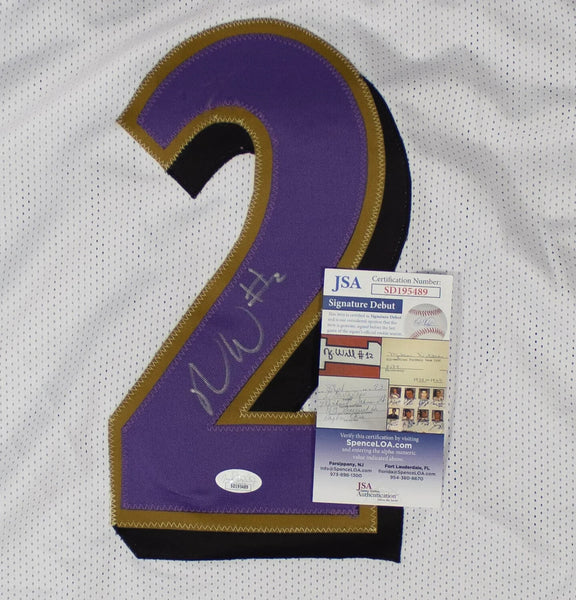 Custom on-field style jersey with everything sewn on, size XL. Hand-signed by Nate Wiggins. The autograph(s) includes an official James Spence Authentication (JSA) "Signature Debut" hologram and COA. "Signature Debut" is the autographed memorabilia equivalent to a rookie card. The JSA definition of a "Signature Debut" is as follows: "Any item that is autographed and received by JSA prior to the last game of the signer's official rookie season.Authentication: JSA COA