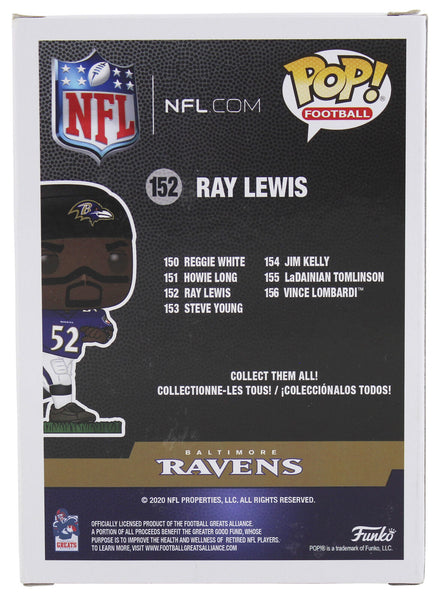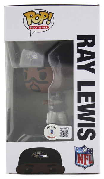 This Autographed w/ White Signature #152 Funko Pop Vinyl Figure has been Personally Signed by Ray Lewis of the Baltimore Ravens. This item is 100% Authentic to include a hologram by Beckett Authentication Services. This item will come with the new Beckett Authentication hologram that has a scannable QR code rather than the traditional COA. If you would like to have a COA, you are welcome to reach out to Beckett for a printed certification once you receive your item. This is a BAS Witnessed Protection Program item which means a Beckett Authentication Service representative was present when this item was being signed. We conducted an autograph signing with Ray Lewis where multiples of the same item were signed. While the photographs are representative of this item, the size, placement and strength of the signature may vary. Each item is hand signed, therefore, each autograph is unique. This item can be verified through BAS Witnessed. The boxes will have some handling wear from shipping to and from the signing. They will ship to you in a pop protector.
