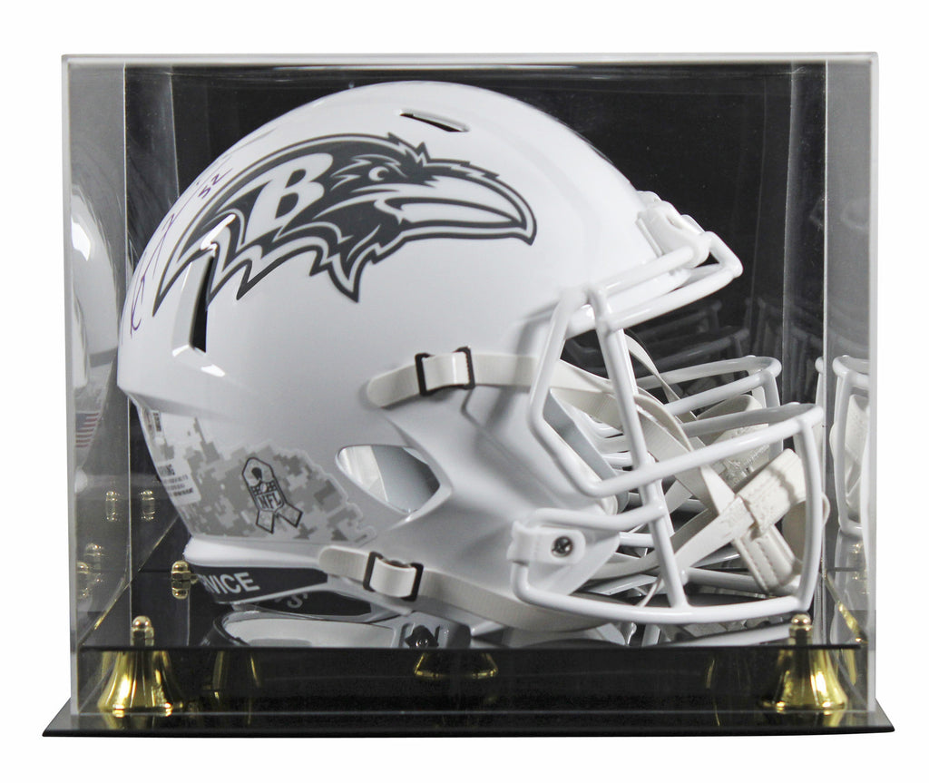 This Autographed Alternate 2024 Salute To Service III Riddell Full Size Speed Rep Helmet W/ Uv Mirrored Back Acrylic Display Case has been Personally Signed by Ray Lewis of the Baltimore Ravens. This item is 100% Authentic to include a hologram by Beckett Authentication Services. This item will come with an affixed Beckett Authentication Services (BAS) authentication sticker, which includes a scannable QR code to verify authenticity. Please note that Beckett no longer provides serial-numbered COA cards, and the attached BAS sticker will serve as the complete authentication for this item. This is a BAS Witnessed Protection Program item which means a Beckett Authentication Service representative was present when this item was being signed. We conducted an autograph signing with Ray Lewis where multiples of the same item were signed. While the photographs are representative of this item, the size, placement and strength of the signature may vary. Each item is hand signed, therefore, each autograph is unique. This item can be verified through BAS Witnessed.