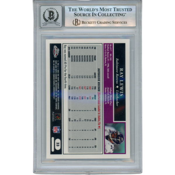 The number in the listing title is just an inventory sku for our records and is not the authentication number. The item pictured is the exact item you will receive, please see photos for condition. This is a Baltimore Ravens 2005 Topps Chrome #33 Slabbed Trading Card that was personally autographed by Ray Lewis. Includes a certificate of authenticity / hologram from Beckett Authentication Services (BAS) and Denver Autographs. FREE SHIPPING within the USA on orders over $10!