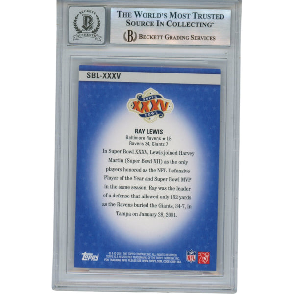 The number in the listing title is just an inventory sku for our records and is not the authentication number. The item pictured is the exact item you will receive, please see photos for condition. This is a Baltimore Ravens 2011 Topps Super Bowl #SB-XXV Slabbed Trading Card that was personally autographed by Ray Lewis. Includes a certificate of authenticity / hologram from Beckett Authentication Services (BAS) and Denver Autographs. FREE SHIPPING within the USA on orders over $10!