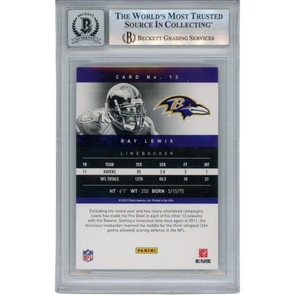 The number in the listing title is just an inventory sku for our records and is not the authentication number. The item pictured is the exact item you will receive, please see photos for condition. This is a Baltimore Ravens 2012 Panini Prestige #13 Slabbed Trading Card that was personally autographed by Ray Lewis. Includes a certificate of authenticity / hologram from Beckett Authentication Services (BAS) and Denver Autographs. FREE SHIPPING within the USA on orders over $10!