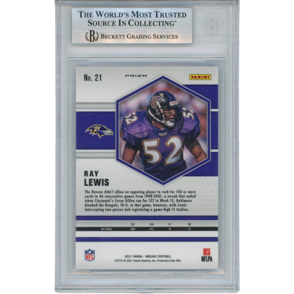 The number in the listing title is just an inventory sku for our records and is not the authentication number. The item pictured is the exact item you will receive, please see photos for condition. This is a Baltimore Ravens 2021 Panini Mosaic Silver #21 Slabbed Trading Card that was personally autographed by Ray Lewis. Includes a certificate of authenticity / hologram from Beckett Authentication Services (BAS) and Denver Autographs. FREE SHIPPING within the USA on orders over $10!