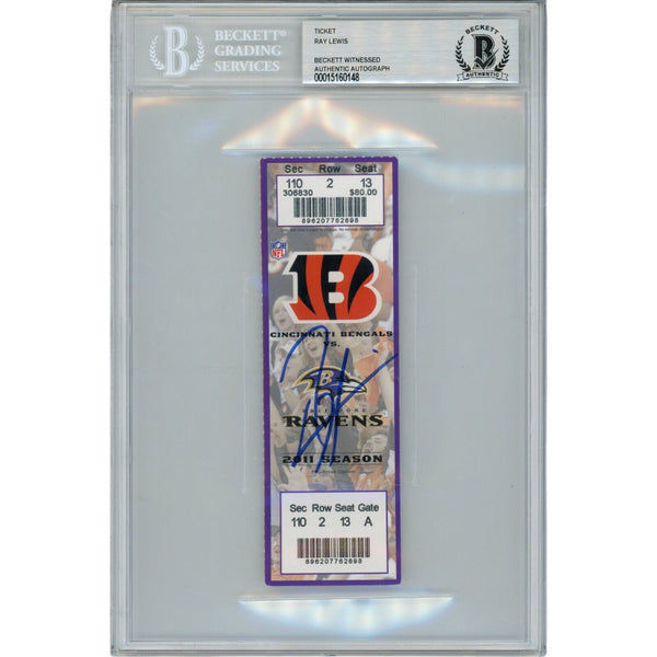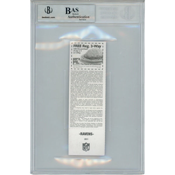 The number in the listing title is just an inventory sku for our records and is not the authentication number. The item pictured is the exact item you will receive, please see photos for condition. This is a Baltimore Ravens Slabbed 01/01/2012 Ticket Stub that was personally autographed by Ray Lewis. Includes a certificate of authenticity from Beckett Authentication Services (BAS) and Denver Autographs.FREE SHIPPING within the USA on orders over $10!