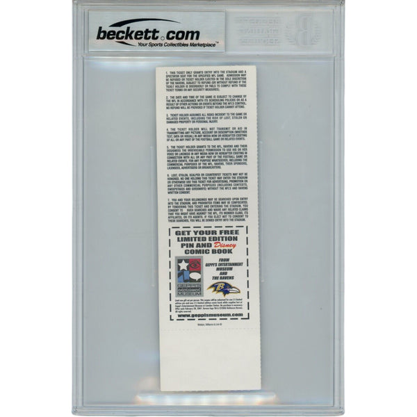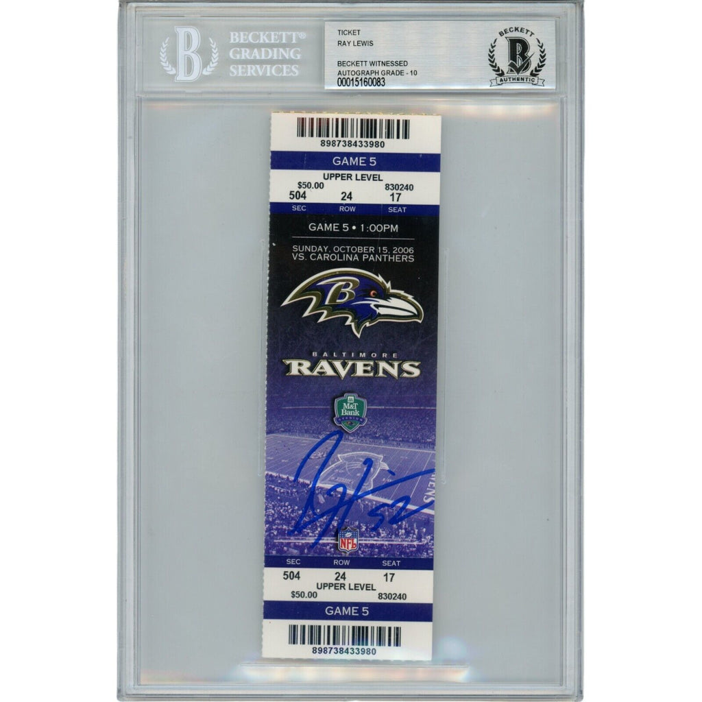 The number in the listing title is just an inventory sku for our records and is not the authentication number. The item pictured is the exact item you will receive, please see photos for condition. This is a Baltimore Ravens Slabbed 10/15/06 Full Ticket Stub that was personally autographed by Ray Lewis. Includes a certificate of authenticity from Beckett Authentication Services (BAS) and Denver Autographs.FREE SHIPPING within the USA on orders over $10!