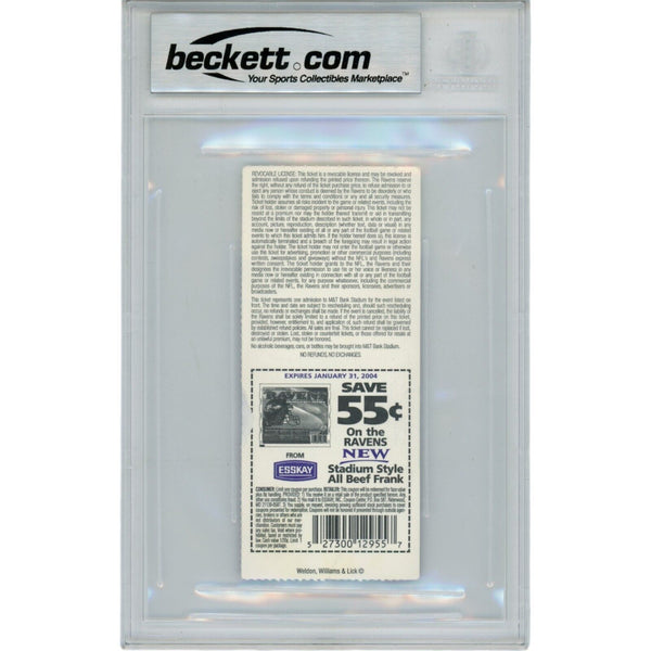 The number in the listing title is just an inventory sku for our records and is not the authentication number. The item pictured is the exact item you will receive, please see photos for condition. This is a Baltimore Ravens Slabbed 10/26/03 Ticket Stub that was personally autographed by Ray Lewis. Includes a certificate of authenticity from Beckett Authentication Services (BAS) and Denver Autographs.
